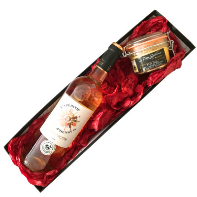Composition : - 1 verrine Foie gras de canard entier du Sud-Ouest Label Rouge 130g - 1 Bouteille de vin blanc Jurançon doux " Aperitif Henri IV" 75 cl Présenté dans un coffret long cartonné fermé "Savoureux"
