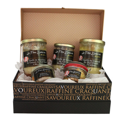 Coffret Autour du Canard Composition : - 1 Foie gras de canard entier du Sud-Ouest Label Rouge - verrine 130g - 1 Confit de canard 2 cuisses LR du Sud-ouest - verrine 700g - 1 Confit de 6 Manchons de canard du Sud-ouest LR verrine 700g - 1 Confit de Gésiers de canard du Sud-ouest LR- verrine 350g - 1 Rillettes de canard - verrine 180g Présenté dans un coffret cartonné fermé "Savoureux"