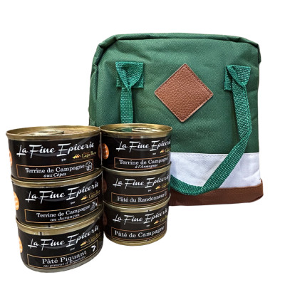 Coffret En Balade Composition : - 1 Pâté piquant au Piment d'Espelette - boite 125g - 1 Pâté du Randonneur - boite 125g - 1 Terrine de campagne - boite 125g - 1 Terrine de campagne au Jurançon - boite 125g - 1 Terrine de campagne aux Cèpes - boite 125g - 1 Terrine de campagne à l'Armagnac - boite 125g Présenté dans un sac isotherme vert et blanc